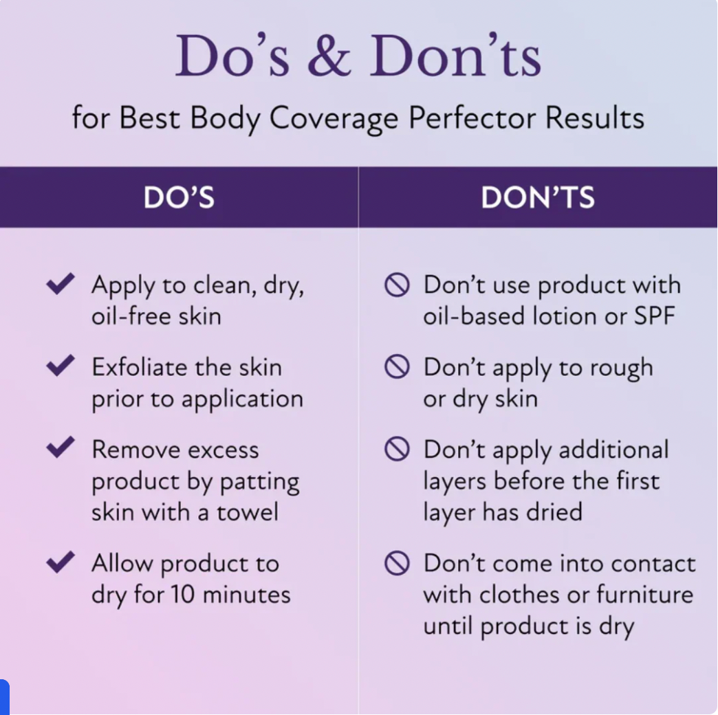Achieve flawless skin in just 60 seconds — no makeup skills or fancy tools needed. Body Coverage Perfector is designed for effortless use. Simply pump a small amount, blend it over your skin with your fingers or a sponge, and let it set. That’s it. No patchiness, no mess — just smooth, even-toned skin that looks naturally radiant all day long. Whether you're heading out in a sleeveless dress or showing off your legs, It makes it easy to feel confident in every outfit.