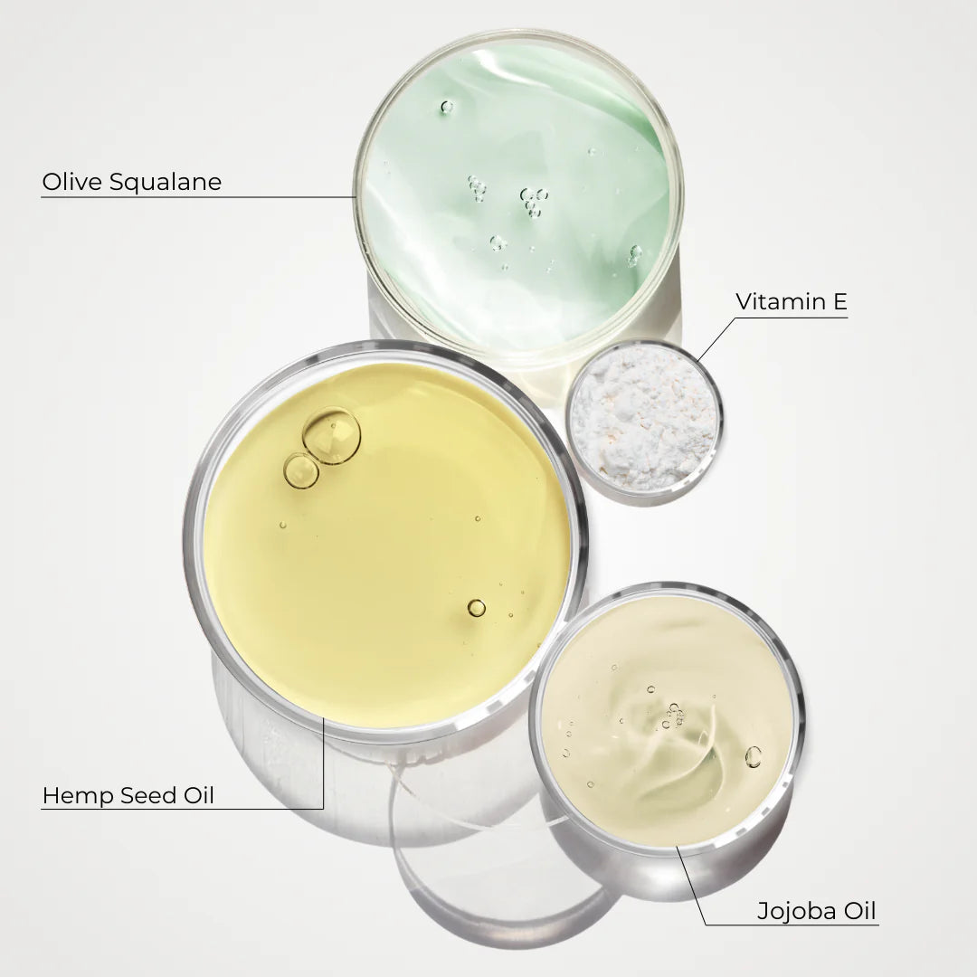 Jojoba Oil, Jojoba Esters, Hemp Seed Oil, Olive Squalane, and Sunflower Seed Oil work together to gently dissolve makeup, dirt, and impurities whilst leaving skin soft and moisturised.